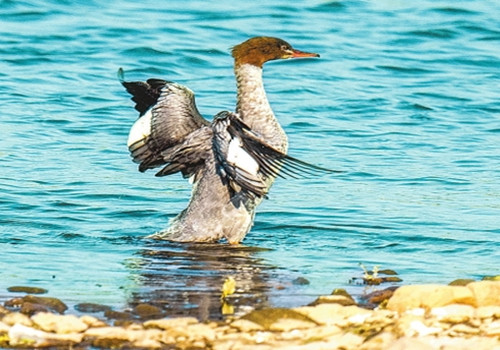 一群中华秋沙鸭时而在天空翱翔,时而在水中嬉戏。这是今年11月下旬以来,新县香山湖国家湿地公园和小潢河区域呈现出的喜人景观。