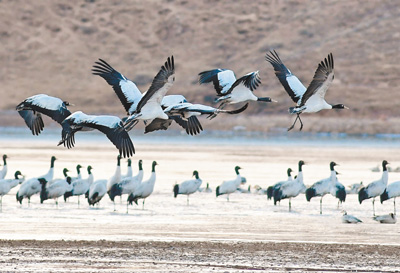 1月1日,西藏拉萨市林周县卡孜水库附近的黑颈鹤。