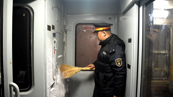 车辆运行中,有时地面的积雪会被刮起,由车厢连接处缝隙向车内倒灌,把门头变成“冰雪世界”。所以每到一站之前,列车员们都要仔细检查厕所、门头、上下水管是否堵塞结冰。
