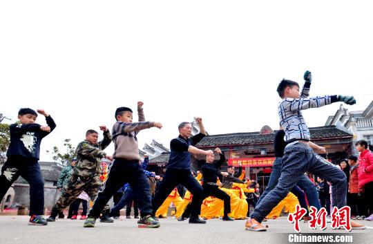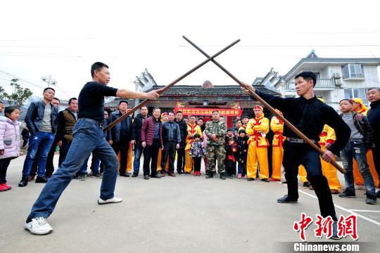 2月14日,江西省万载县黄茅镇源头村村民表演拳术迎新年。 苏路程 摄