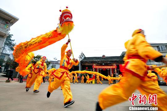 2月14日,江西省瑞金市泽覃乡安治畲族村修葺一新的蓝氏宗祠内,当地畲族穿龙灯民俗活动正在上演,喝彩声此起彼伏。 朱燕 摄
