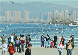 春节期间,昆明的好天气好景致吸引了众多省内外游客前来春城旅游度假。图为游客在海埂大坝观鸥赏景。(记者 张彤 摄)