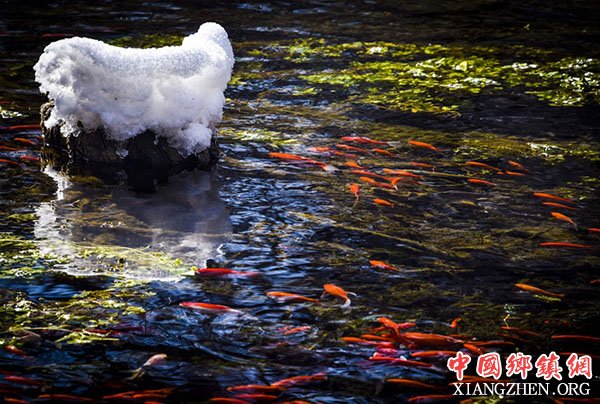 2月20日,市民在乌鲁木齐市水磨沟公园边喂鱼边欣赏雪景。