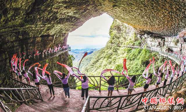 7月29日,爱好者在南川金佛山绝壁栈道上展示水袖舞。当日,金佛山景区西坡绝壁栈道上迎来了近100名水袖舞爱好者,她们在3公里长、2000多米高的绝壁栈道上翩翩起舞,舒展摇曳,人与自然融为美丽景观。特约摄影 瞿明斌