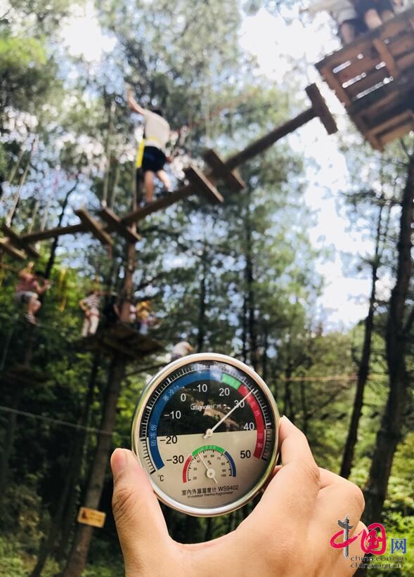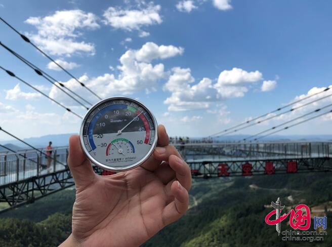 作为奥陶纪这一网红景区的入口处,集结了天空悬廊、18米悬崖秋千、步步惊心等爆款网红项目。这一区域由于极少有绿荫遮蔽,本以为温度会较高。但是,当下午两点钟,记者来到景区标志性项目天空悬廊时,拿出温度计,指针定格在了29摄氏度。