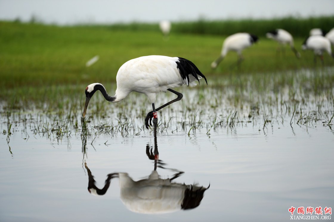 8月1日,在黑龙江扎龙国家级自然保护区内,一只丹顶鹤在水中觅食。