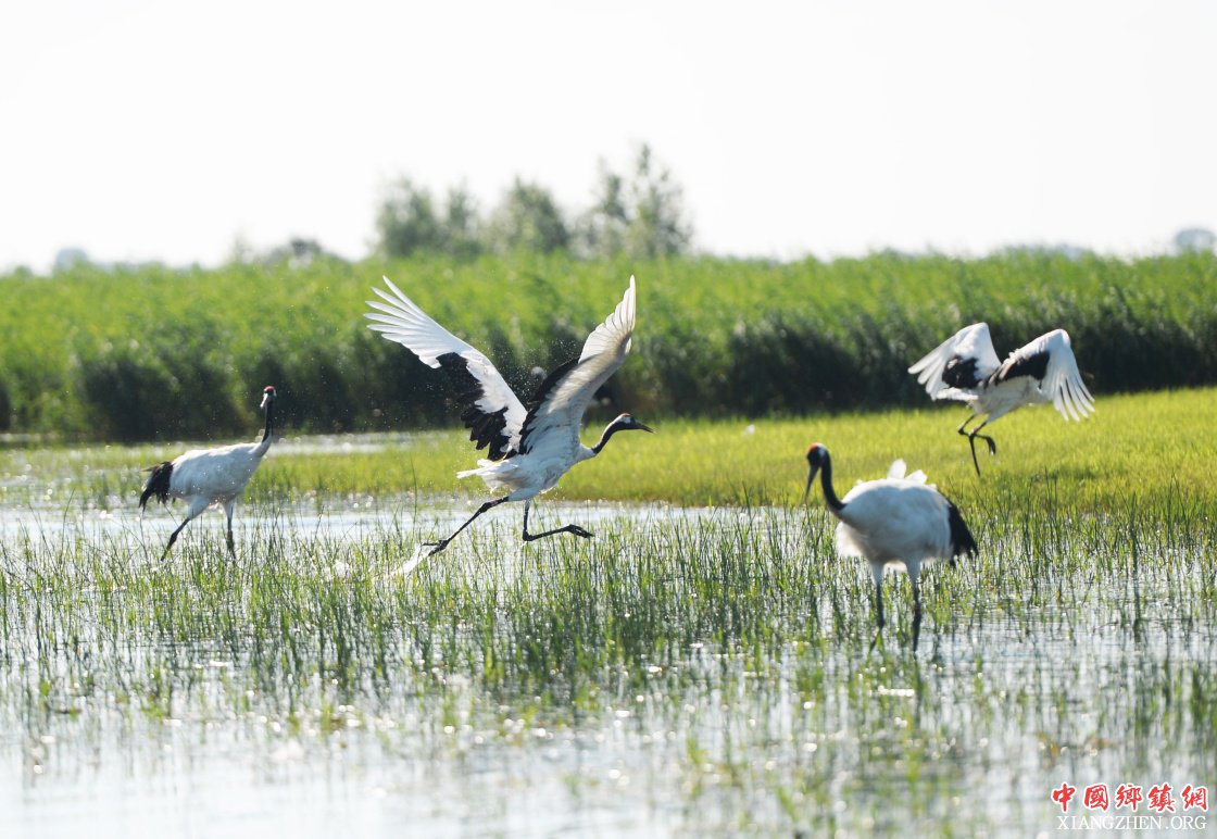 7月31日,在黑龙江扎龙国家级自然保护区内,丹顶鹤在水中嬉戏。