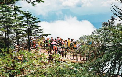 图为8月5日,游人在海拔2830米的瓦屋山景区山顶平台游览。