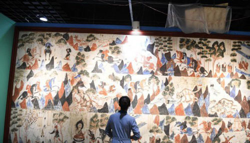 8月6日,通过数字化采集打印展出的大幅高保真莫高窟复制壁画482窟“萨埵太子本生故事”亮相敦煌。近日,“丝路美地·敦煌”展在甘肃敦煌国际会展中心展出,展览展出了大幅高保真复制壁画、3D打印彩塑、复制洞窟等,此次展览通过数字化、多元立体展示,让民众“零距离”体验敦煌艺术之美。 中新社记者 杨艳敏 摄