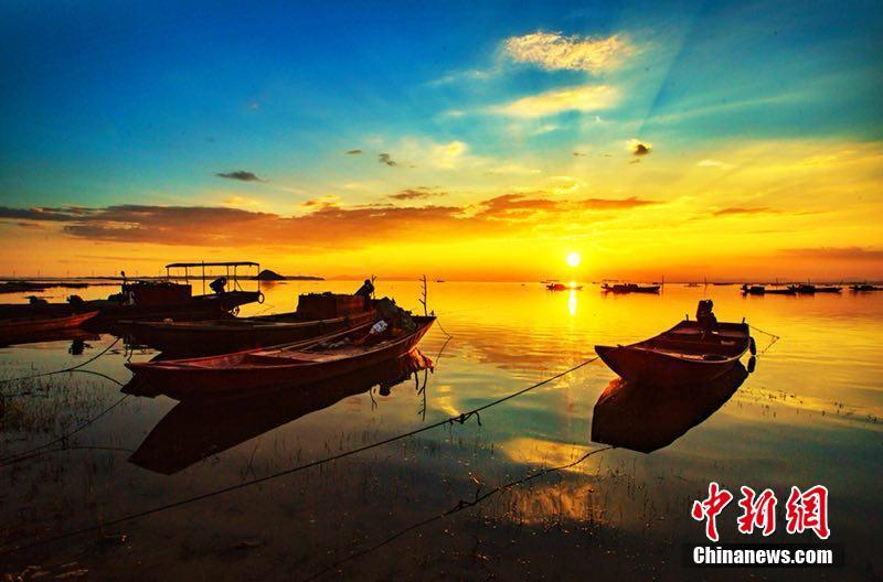 位于江西的中国最大淡水湖鄱阳湖出现五彩缤纷的彩霞,云朵瞬息万变,五光十色,绚丽夺目。傅建斌 摄