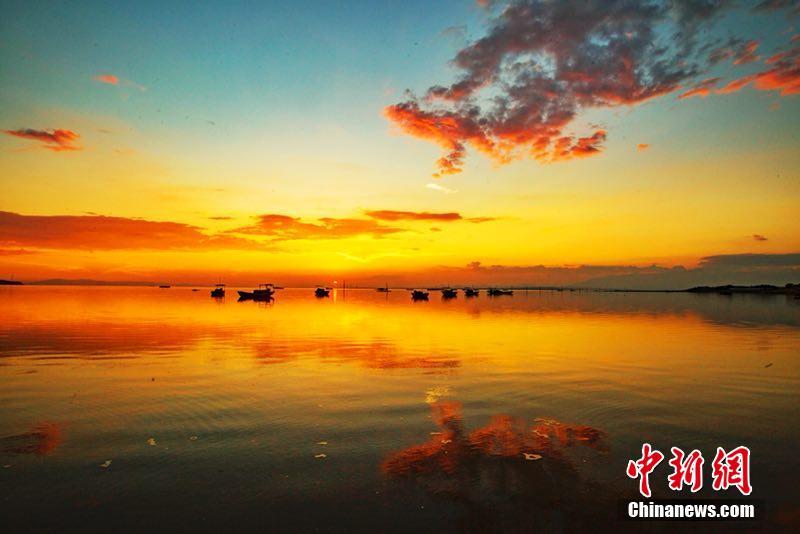 8月28日傍晚,在中国最大淡水湖鄱阳湖江西都昌矶山水域上空出现五彩缤纷的彩霞,与蓝天、白云、航行的船只和静谧的水面交织呼应,让旷阔的水面幻化成“天空之镜”,绚丽壮观。傅建斌 摄