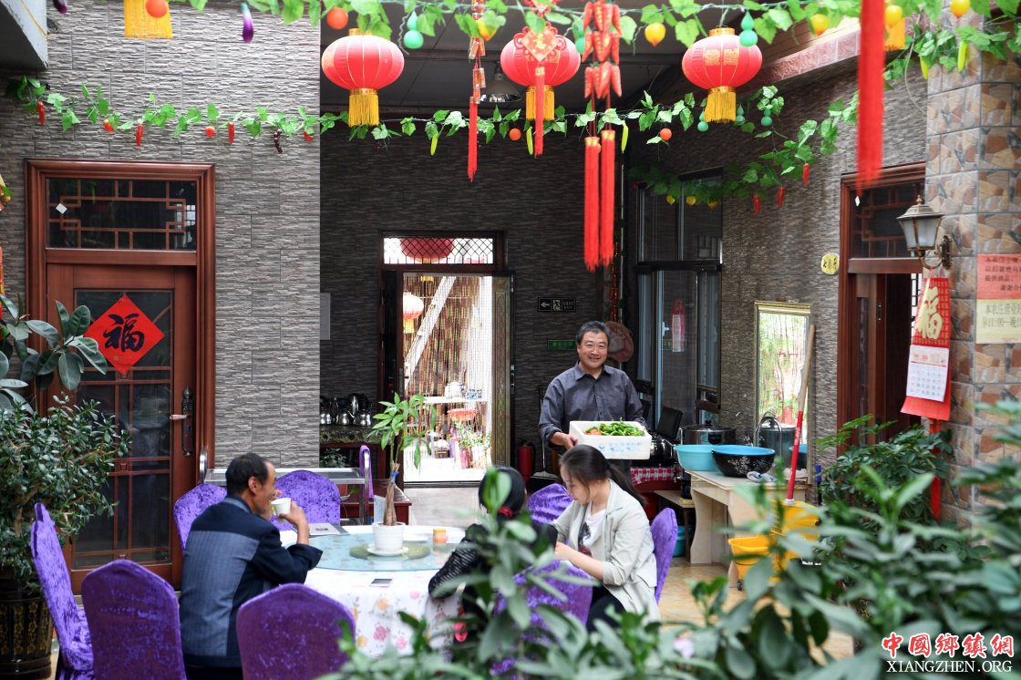 在张掖市肃南裕固族自治县康乐镇榆木庄村,村民张伟(右一)在自家开办的农家乐中忙碌(8月28日摄)。