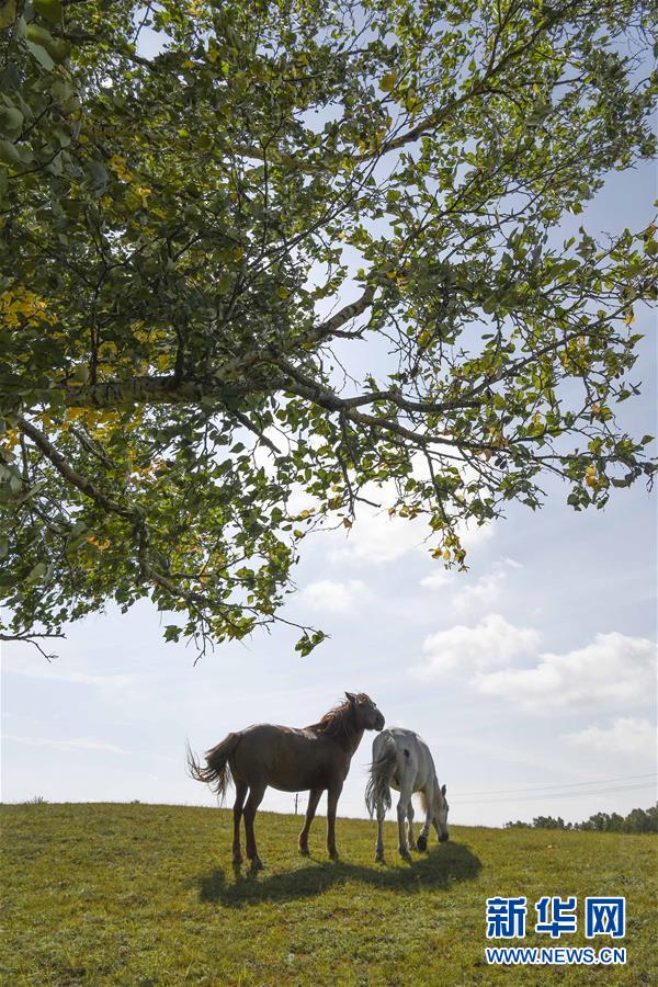 9月1日,两匹马在内蒙古乌兰布统草原的桦树下吃草。