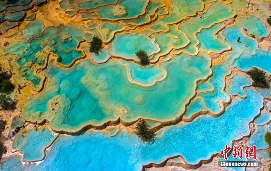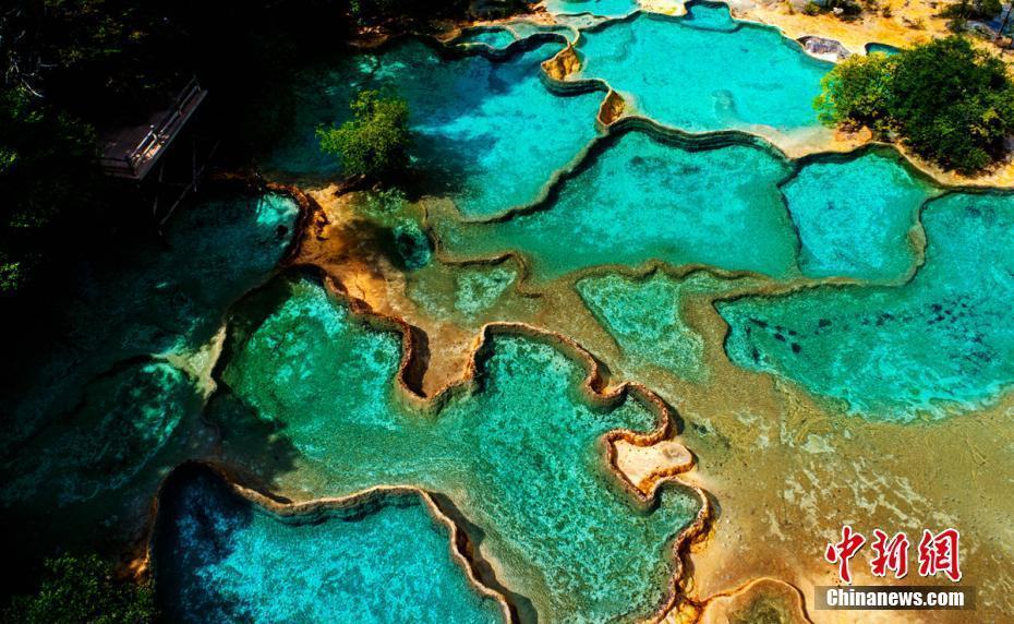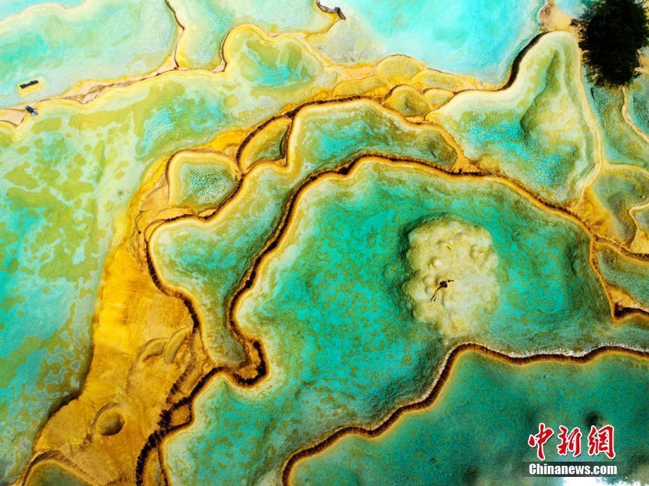 远看块块彩池宛如片片碧色玉盘,蔚然奇观。杨建 摄
