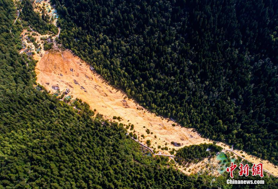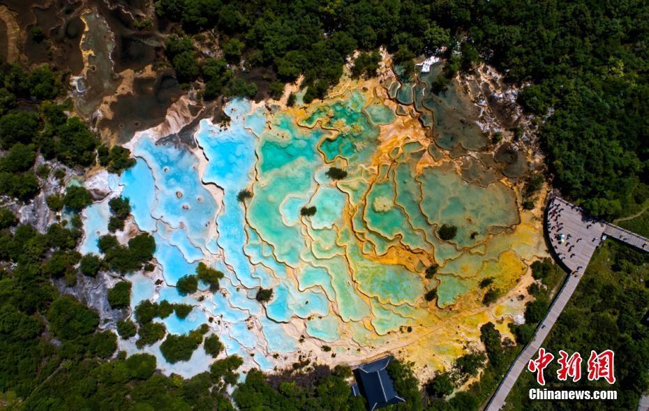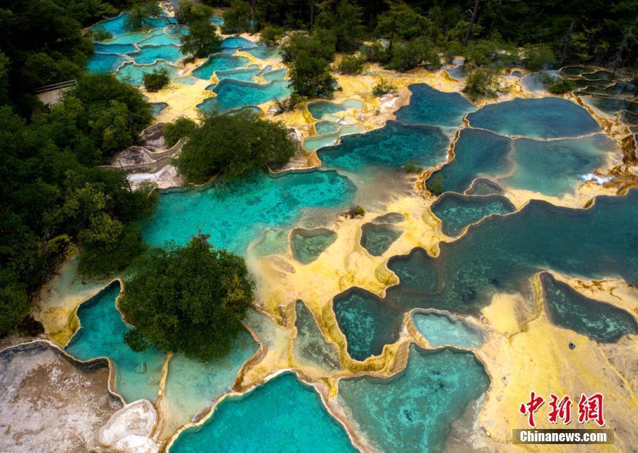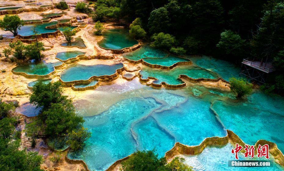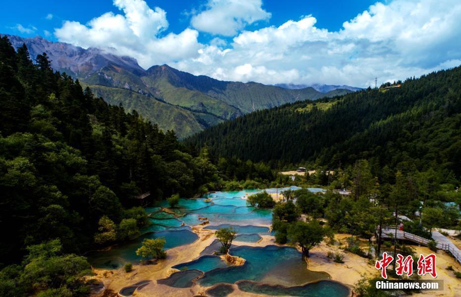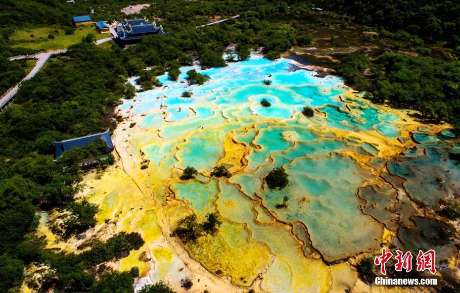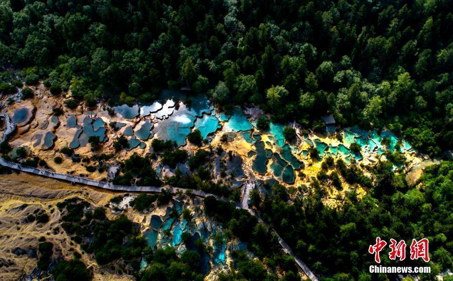 黄龙景区内历经千百年形成的地表钙华蜿蜒在峡谷中,碧透斑斓的彩池,宛如五彩珍珠镶嵌在原始森林中,被誉为“人间瑶池”。杨建 摄