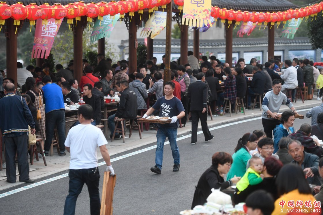 当日,在浙江省桐庐县莪山畲族乡龙峰民族村,一百桌宴席沿道路摆成一字长蛇阵,四方宾客和当地村民一起品尝着具有畲族特色的菜肴,场面颇为壮观。