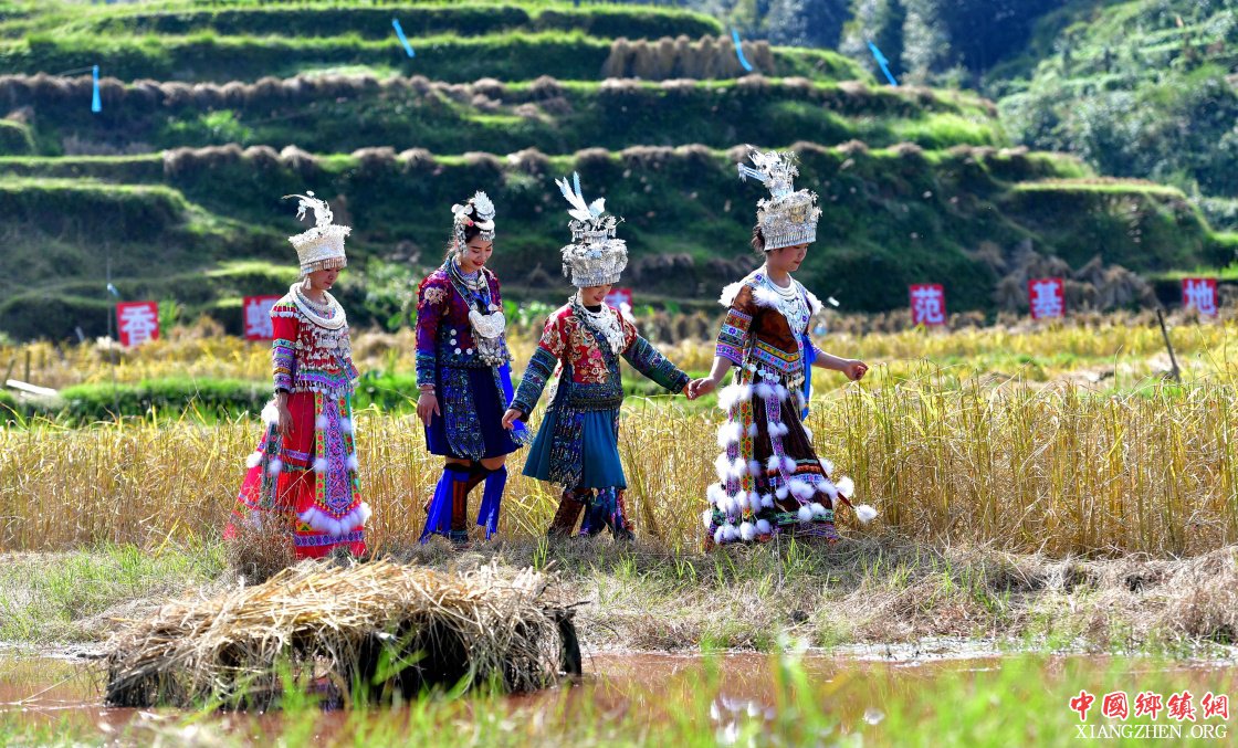 10月28日,在广西融水苗族自治县拱洞乡龙令村,苗家姑娘前往田间观看摸螺抓鱼比赛。