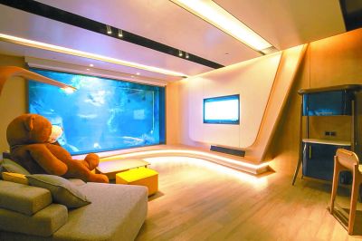 在水下复式套房里,首层设有接近深坑水面的户外露台和卧室,起居室则位于水面以下,这里就像水族馆,坐在房间里,可以看到各种鱼儿从眼前游过。酒店里还设有被水族馆环抱的特色餐厅,就像在五彩斑斓的海底世界用餐。