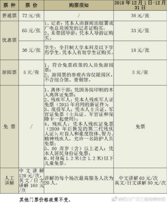 人民网成都11月27日电 (任重)据三星堆博物馆官方微博消息,因三星堆文物预防性保护项目和基本陈列提升改造工作实施需要,11月3日起,已经对青铜馆的【部分】展示区域实行临时隔离施工。此外,12月1日到31日,将对综合馆实施闭馆施工(青铜馆、12月26日闭展前的#南丝路上的人与神#临展厅可正常参观)。施工期间门票和讲解票价格有所调整,如下图: