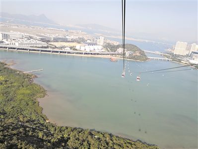 游玩大桥周边,最让人尖叫的莫过于在全景缆车上俯瞰大桥全景。香港人工口岸一侧是香港国际机场,另一侧不远便是大屿山。昂坪360是位于大屿山脚下的一个缆车景点,这是世界十大最佳缆车,水晶般的全透明车身让人全方位观赏外景。现在,你不仅可以看到翠绿山色,更可以俯瞰港珠澳大桥。