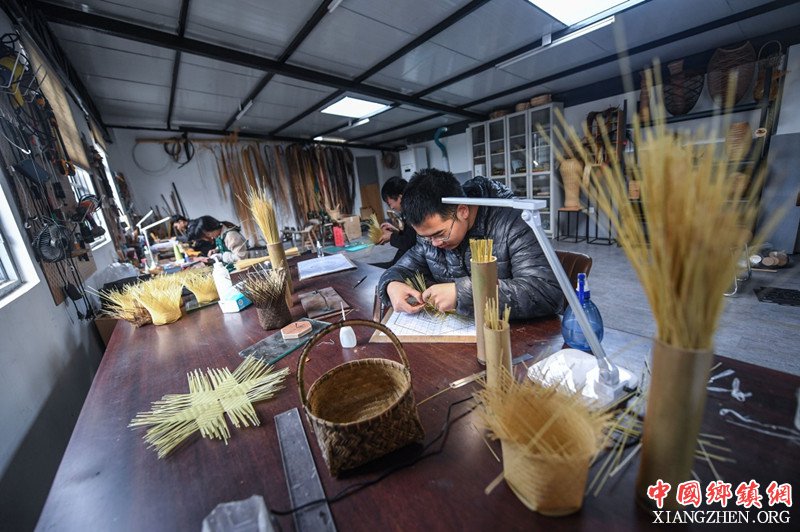 在乌镇陈庄村竹芸工房内,工作人员在制作竹编产品(11月20日摄)。
