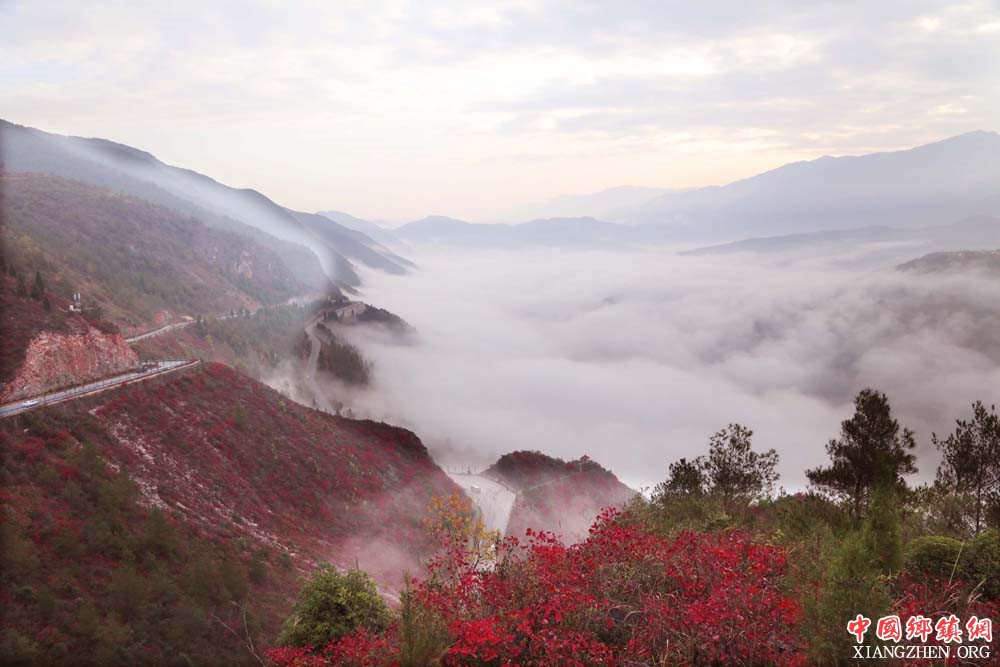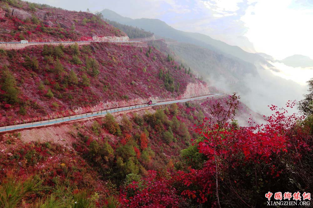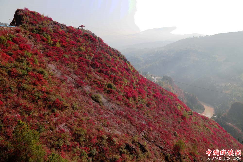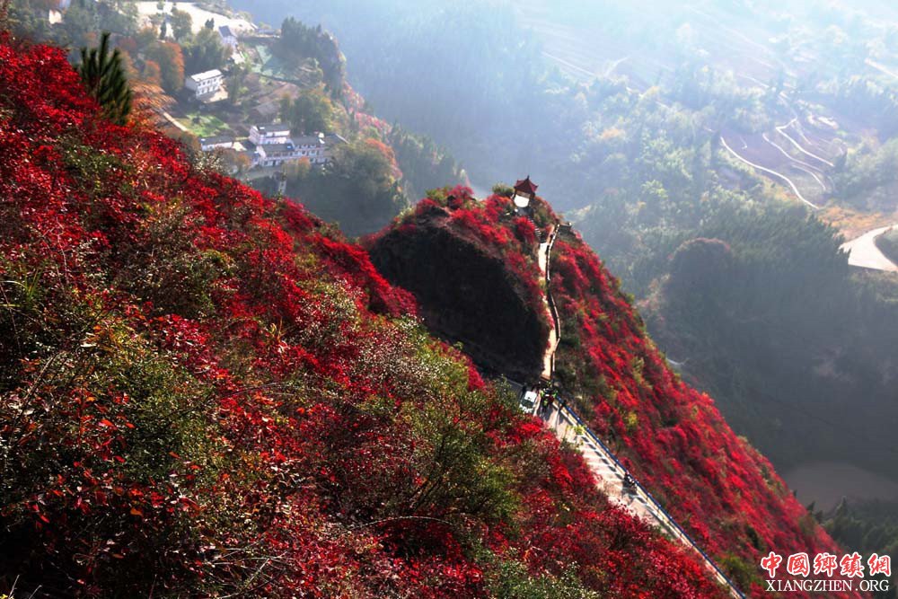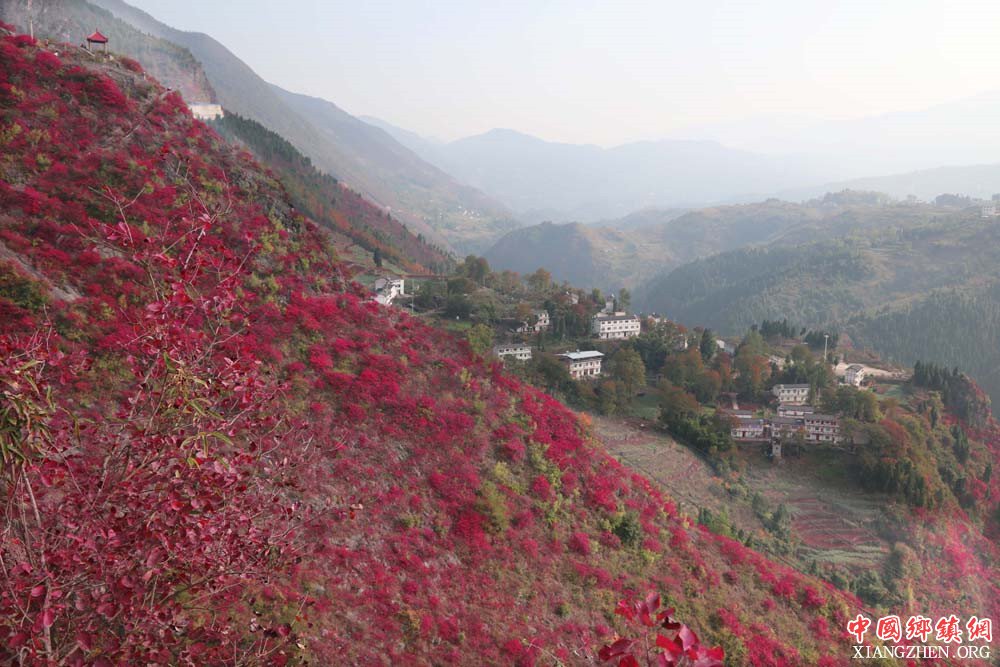 (中国乡镇网重庆讯)国家全域旅游示范区重庆市巫山县官渡镇紫阳景区满坡黄栌红叶似彩霞。日前,黄栌子正绽放着独美的红靥笑迎四方宾客。