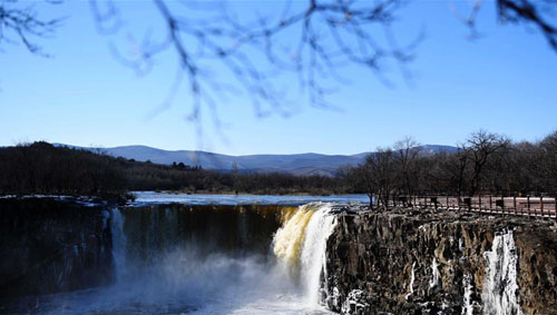 吊水楼瀑布的冬季飞瀑奇观(12月5日摄)。 受上游来水量大和近期气温偏高等因素影响,位于黑龙江东南部的火山堰塞湖——镜泊湖的吊水楼瀑布水量充沛,展现出飞流直下、水雾升腾的冬季奇观,引来许多游人观赏。 新华社记者王建威摄