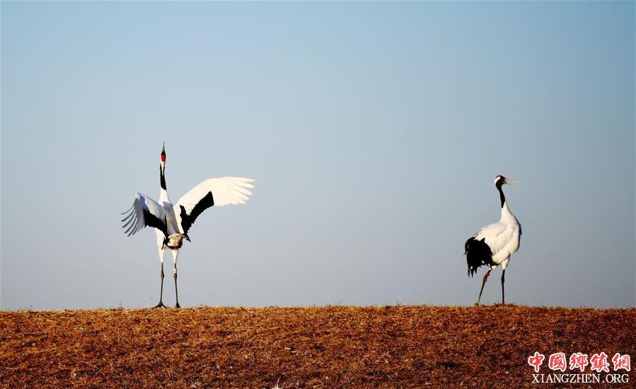 在黑龙江扎龙国家级自然保护区,两只人工繁育的丹顶鹤在“散步”、“起舞”(1月10日摄)。
