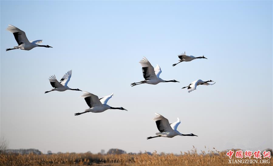 在黑龙江扎龙国家级自然保护区,一群人工繁育的丹顶鹤在空中飞翔(1月10日摄)。新华社记者王建威摄