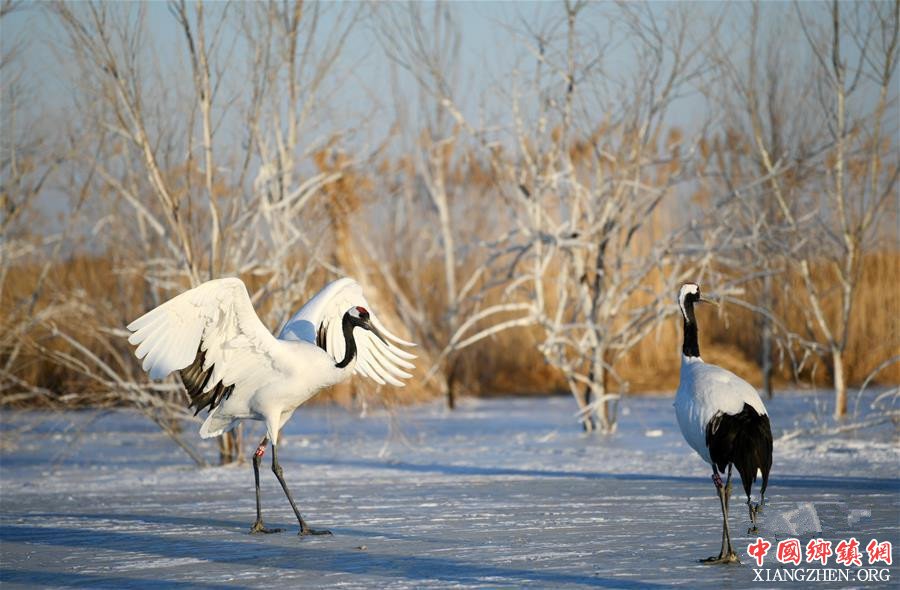 在黑龙江扎龙国家级自然保护区,两只人工繁育的丹顶鹤在冰上“散步”、“起舞”(1月10日摄)。新华社记者王建威摄