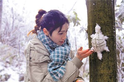 美女用冰雪塑造的“乌龟上树”