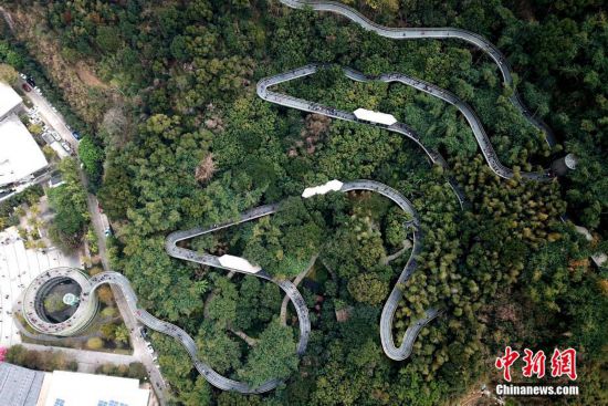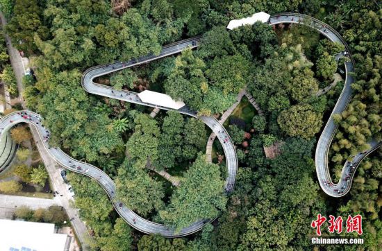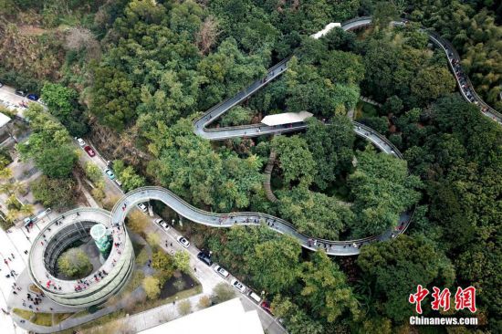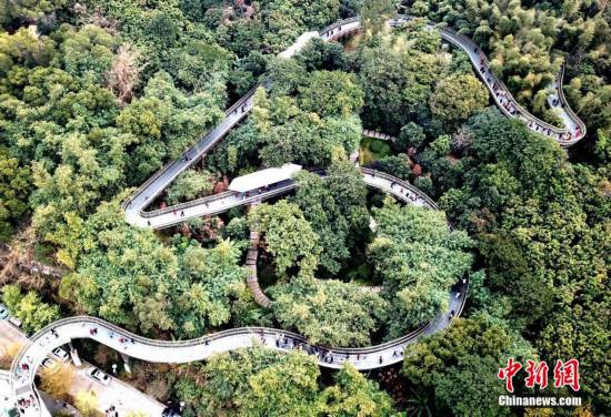 2月5日,农历正月初一,福州市民及外地游客在城区最美的“福道”踏春。空中鸟瞰“福道”,整个栈道被绿树包围,游客宛如走进一个天然大氧吧。中新社记者 王东明 摄