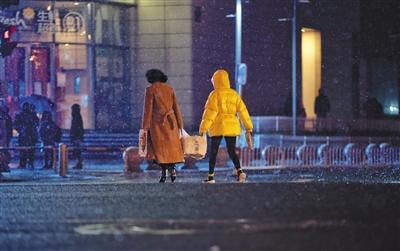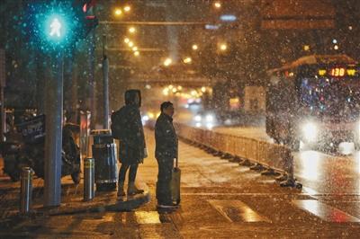 昨(6号)日,朝阳路,两名行人在雪中等绿灯。