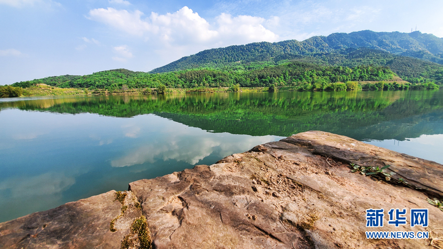 春风和煦,玄天湖景区,湖水宛如明镜,树木郁郁葱葱,繁花竞相开放,青草翠色欲滴。 新华网发(刘磊 摄)
