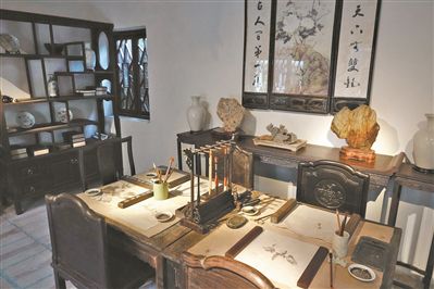 紫梨花馆是园内仅存的旧建筑,如今这里复原了二人的画室,笔墨纸砚排列在桌上,仿佛作画之人只是刚刚起身离开。
