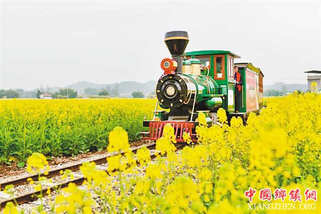 观光小火车在万亩油菜花海穿梭。