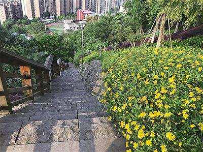 观光道路面铺装红色塑胶颗粒,像一条长龙蜿蜒在翠绿山间。站在观光道上,脚下是嘉陵江和化龙桥一带的高楼大厦,对岸的鸿恩寺和在建的红岩村大桥仿佛就在咫尺之间。