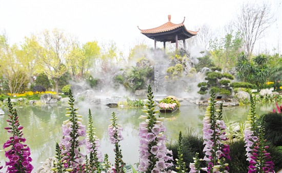在各省区市展区内,广东园以“南粤园”命名,有南粤坊、丝香阁、倚翠廊、蝶翠亭、里仁洞和盆景园等六大景点,面积2500平方米。南粤园注重把岭南的花木灌丛与英石、“广东绿”等散石相衬运用,展现鲜明的地域特色。同时,巧妙将新会葵艺、潮州木雕、佛山陶瓷等岭南文化元素融入到广东园景观中,全方位展示南粤风情。室内展区以“榕树下美丽广东”为主题,突出“小鸟天堂大榕树、广东剪纸、岭南盆景、丹霞珠水”等创意元素,布展展品共五大类140多个品种400多盆。展出期间,室内展园安排四次换展,分别突出“树”“花”“香”“果”小主题,多层次展示岭南园林整体风貌。