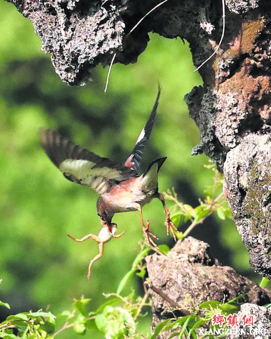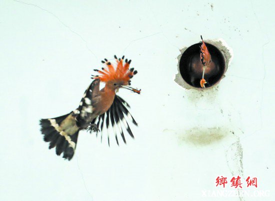 5月12日,成都市新津县兴义镇兴义绿道旁的一居民小区,两只戴胜鸟往返于田野与巢穴,他们不断捉回虫子,喂食刚出壳不久、嗷嗷待哺的幼鸟。戴胜鸟因为繁殖困难,在成都平原并不常见,其外形非常独特:头顶五彩羽毛,尖长细窄的小嘴,错落有致的羽纹……