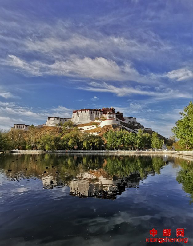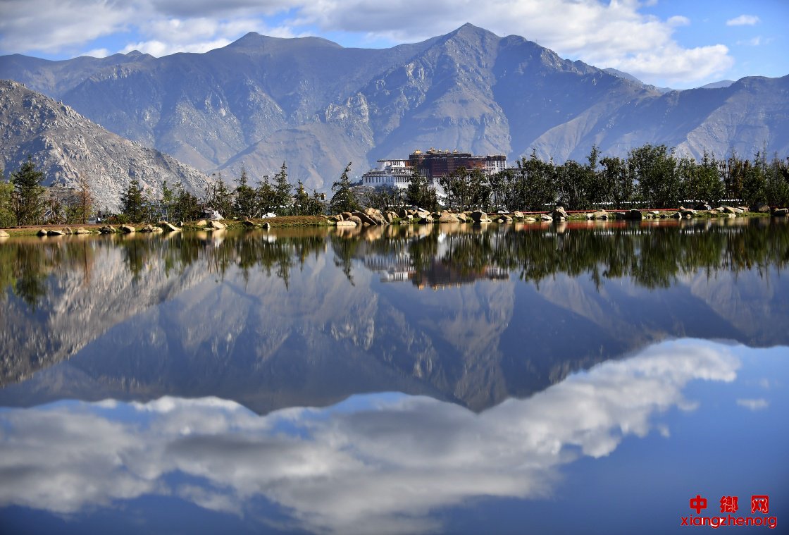 6月5日拍摄的蓝天白云和绿水之间的布达拉宫。