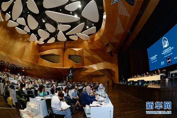 这是7月5日在阿塞拜疆巴库拍摄的世界遗产大会现场。第43届联合国教科文组织世界遗产委员会会议(世界遗产大会)5日在阿塞拜疆巴库举行,会议审议通过将中国黄(渤)海候鸟栖息地(第一期)列入世界自然遗产名录。该项目成为中国第54处世界遗产。新华社发(巴巴耶夫 摄)