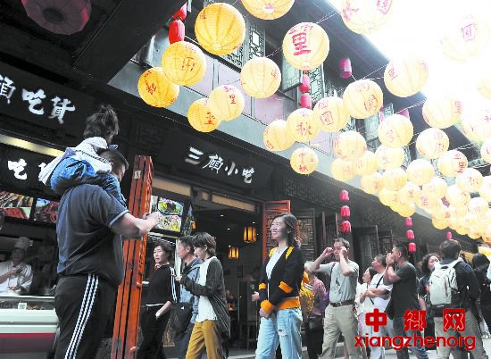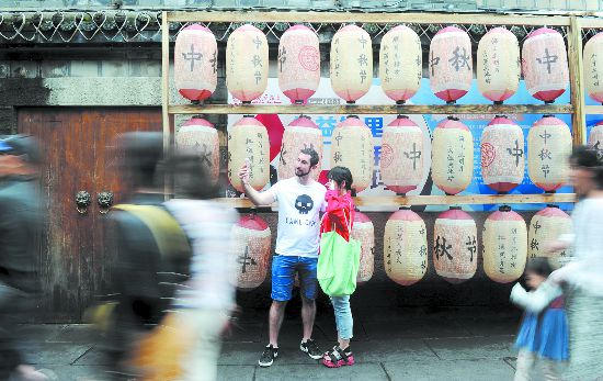 昨日,绵绵秋雨暂停了脚步,清新的空气让游客感到分外惬意。在锦里古街,圆圆的如同金色月亮般的古风灯笼挂满街区,灯笼上“中秋团圆”的大字,让这里的节日气氛格外浓郁。古街上还设置了一面由上百个灯笼组成的景观墙,一句句印在灯笼上咏诵中秋月色的诗歌,引得游客纷纷驻足留影。锦里古街度中秋,来自世界各地的游客,在这里体验着巴蜀韵和成都味。
