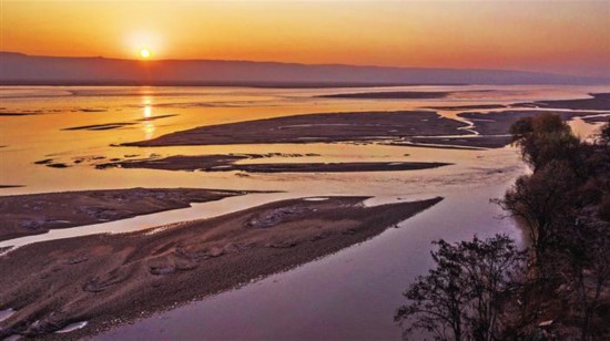 清晨,在黄河陕西省合阳段,河滩在朝霞的映照下,景色迷人。
