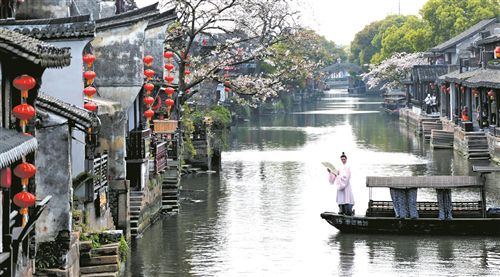 4月1日,浙江省嘉兴市嘉善县西塘古镇景区里,一名游客身着汉服乘坐游船赏樱花。西塘古镇景区面向游客发放旅游消费券8万张,总价值400万元,以“真金白银”拉动景区内相关旅游业态的综合消费。据悉,西塘景区有1500多户商户,目前有85%的商户已经复市。