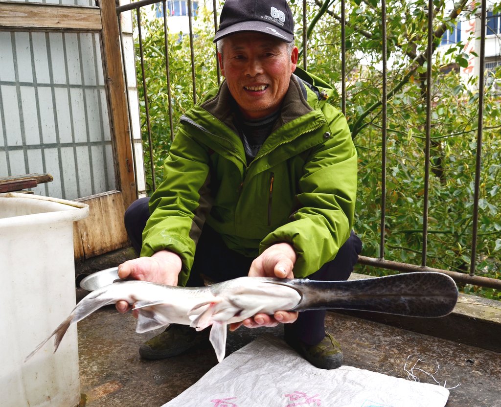 2015年3月26日,安徽省巢湖市,家住巢湖市的佘师傅在巢湖闸附近水域钓鱼,一不留神钓出一条“怪鱼”。这条“怪鱼”身长约80厘米,而且吻部(嘴巴)形似鸭嘴和扁平的汤匙,长约20厘米,体重约1.5斤,外形与中华鲟相似。“怪鱼”的头部还布满了规则的花纹,身上光溜溜的,没有一片鳞片,背部呈深灰色。佘师傅说,钓鱼钓了几十年,还是第一次碰到。水产专家经过初步鉴定后确认,这是世界珍稀鱼类——匙吻鲟。这条匙吻鲟很可能是人工养殖,不慎游进巢湖的。马丰成/CFP |