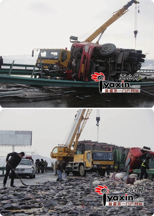 亚心网讯(记者段小利)4月9日清晨5时许,一辆满载活鱼的货车从武汉驶往乌鲁木齐途中,在连霍高速公路乌鞘岭隧道群路段1870公里+800米处(甘肃武威天祝县境内)侧翻,车厢中22吨活鱼散落一地,被闻讯赶来的当地村民哄抢一空,10日,这车鱼的主人——乌鲁木齐市北园春水产批发市场商户张信如说:“车上的司机和押运员受重伤,一车鱼没了,我至少损失50万元。”