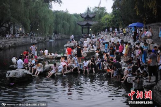 7月26日,在济南护城河黑虎泉景区段白石泉,近百人扎堆在泉池里泡脚,场面十分壮观。由于持续高温“烧烤天”的影响,令不少市民来此消暑泡脚,尽管河岸保安用喇叭持续几个小时高喊禁止不文明泡脚,却无人搭理。 图片来源:CFP视觉中国