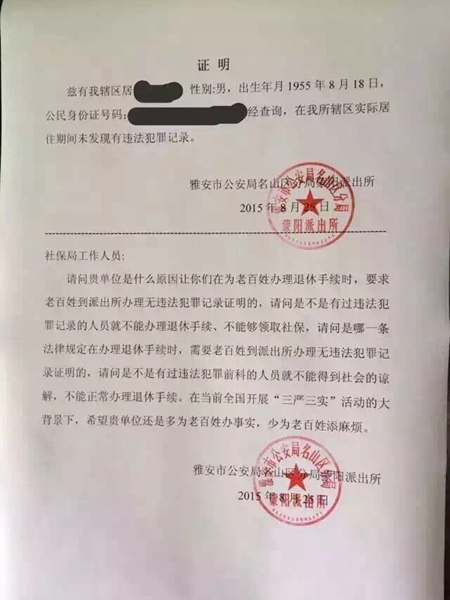 四川在线消息(四川日报记者 游飞)8月25日13:11,网友@高臻臻姐姐在微博晒出一张当天由雅安市公安局名山区分局蒙阳派出所开具的一则无违法犯罪记录证明,在这张证明同一张纸下方,蒙阳派出所还附上一封给社保局工作人员的信,质疑社保局工作人员“哪一条法律规定在办理退休手续时,需要老百姓到派出所办理无违法犯罪记录证明”,信中同时建议“贵单位还是多为老百姓办实事,少为老百姓添麻烦”。这封信和证明一起,分别都盖有雅安市公安局名山区分局蒙阳派出所的公章。