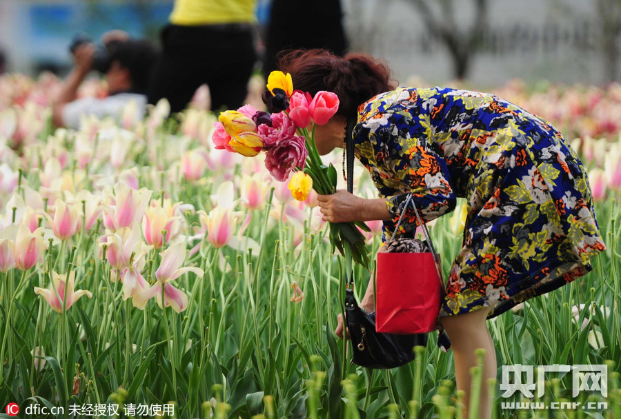 2016年4月10日,市民在江西九江第五届郁金香花博会上采摘郁金香。自3月26日开始,江西九江第五届郁金香花博会开幕,20余万株品种各异的郁金花竞相怒放。在双休日,一些市民乘着工作人员不注意时,随手采摘郁金香、任意踩踏花田的不文明行为时有发生,全然不顾花海中安插的警示牌。