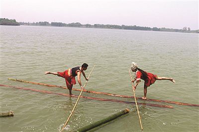 据了解,苏州太湖国家湿地公园邀请来自贵州遵义的独竹漂高手,为观众们表演别样的“水上竹竿芭蕾”。记者在现场看到,6名高手身着苗族服饰,每人脚下踩着一根毛竹,漂浮在湖面上,毛竹的宽度跟脚掌差不多,普通人即便在陆地上也难以站稳,可他们在水面上仍稳如泰山。他们的手中拿着一根细竹竿当作船桨,在湖面上进退自如。随后,他们还展示出更多的绝活,做出金鸡独立、燕子探海、劈叉、转呼啦圈、飞跃跳竿、转圈等惊险刺激的动作,着实让游客们惊叹。据介绍,独竹漂又称独竹舟,是发源于赤水河流域的一种独特的黔北民间绝技。